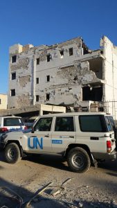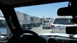 كانت هناك أشجار محترقة، وأنقاض وحطام أبنية ممتدة على الشوارع عندما دخلنا المدينة لتسليم مساعدات كجزء من قافلة الإغاثة المشتركة للأمم المتحدة والصليب الأحمر الدولي والهلال الأحمر العربي السوري. وكانت هذه أول مساعدات إنسانية تصل الى المنطقة منذ بدء النزاع في سوريا منذ سبع سنوات.